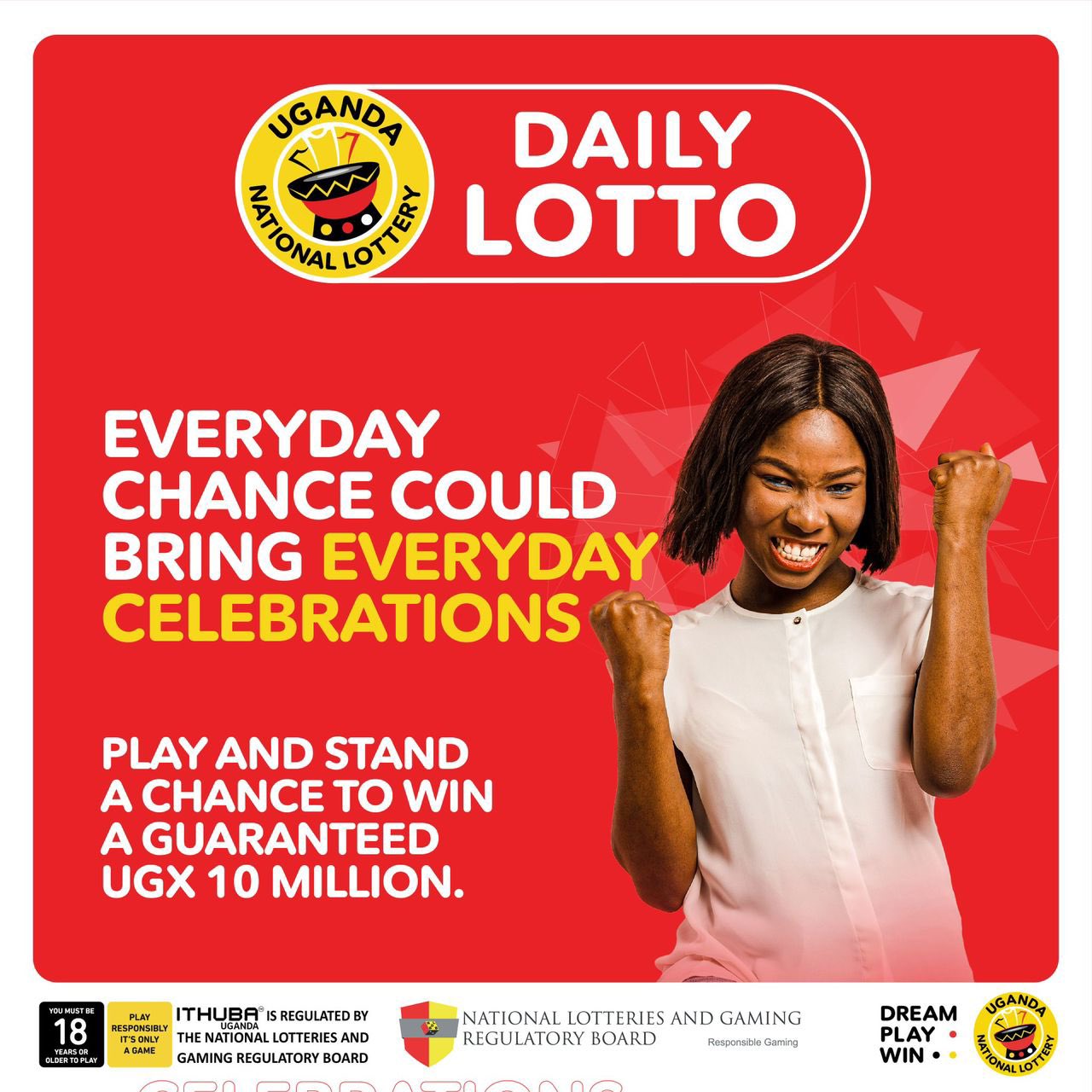 Everyday is a chance to win millions with DAILYLOTTO Play today and stand a chance to win a GUARANTEED UGX 1 Million Jackpot. Buy your tickets NOW in authorized shops OR Very well made.