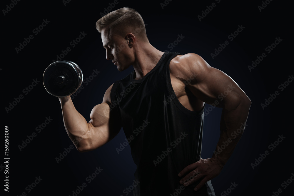 Handsome power athletic man in training pumping up muscles with Very well made.