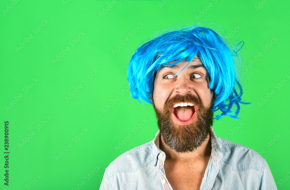 Funny bearded man wearing blue wig. Handsome bearded man with stylish mustache in wig. Fashion art and creativity concept. Barbershop. Hipster in periwig. Happy stylish man in blue hair. Copy space. S... Very well made.