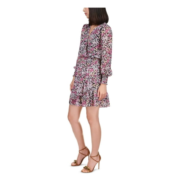 MICHAEL MICHAEL KORS Womens Black Smocked Ruffled Sheer Tiered Skirt Lined Floral Long Sleeve Surplice Neckline Short Party Faux Wrap Dress P XS Walmart Very well made.