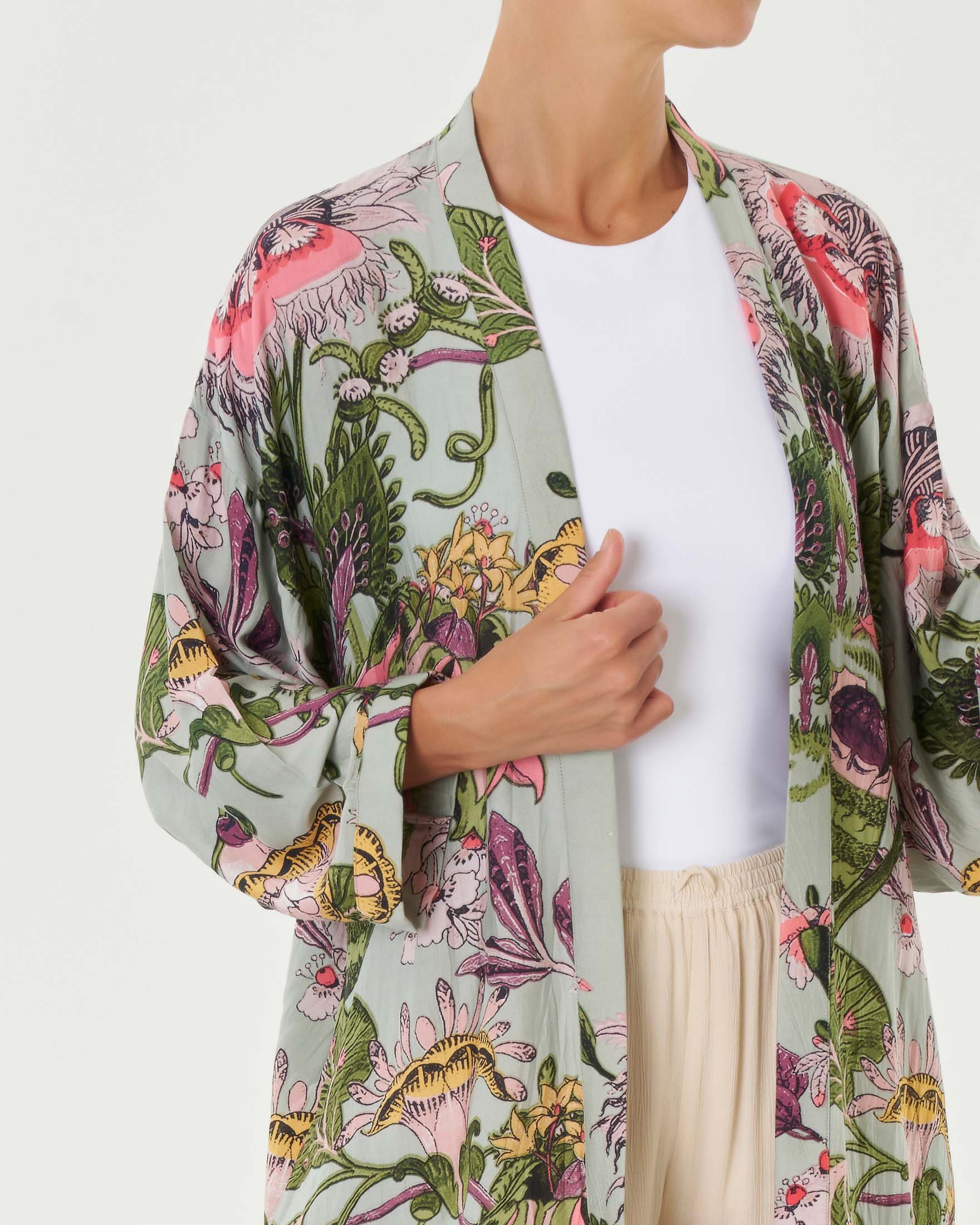 Kimono lungo grigio a fantasia floreale rosa e verde in misto viscosa e modal Very well made.