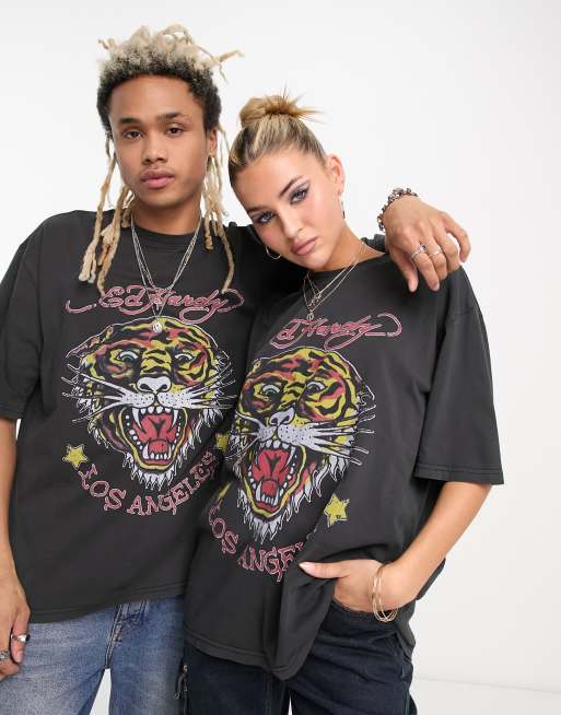 Ed Hardy Unisex ruimvallend T shirt in verwassen zwarte LA Tiger Very well made.