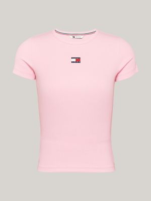 Geripptes Slim Fit T Shirt mit Badge Rosa Tommy Hilfiger Very well made.