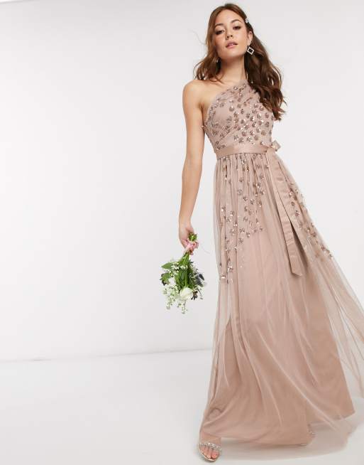 Maya Lange jurk met blote schouder en versiering in taupe Very well made.
