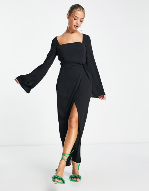 ASOS DESIGN Midi jurk met vierkante halslijn knoopdetail en uitlopende mouwen in zwart Very well made.