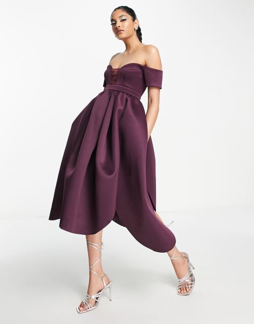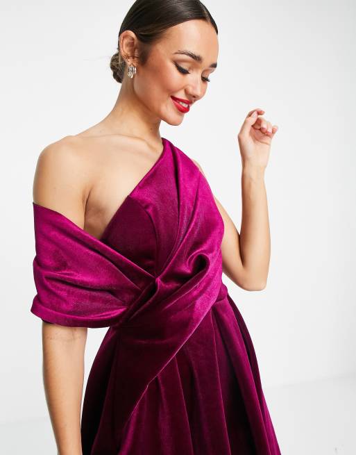 ASOS DESIGN Fluwelen midi galajurk met blote schouders in bessenrood Very well made.