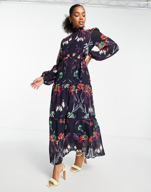 Hope Ivy Maxi jurk met lange mouwen en gestrikte taille in marineblauw met bloemen Very well made.