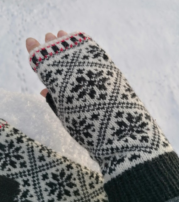 Gloves without fingers natural wool knit nice nordic star pattern of Solekiri soft and warm arm cuffs for women Very well made.