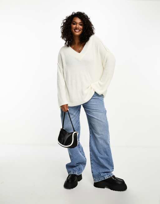 Only Curve Pluizige trui met V hals en lange pasvorm in cr me ASOS Very well made.