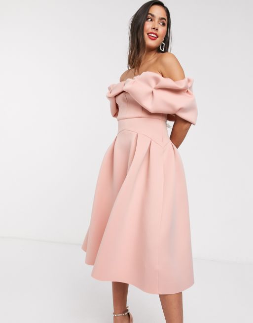 ASOS DESIGN Midi bubble avondjurk met bardot halslijn in nude Very well made.