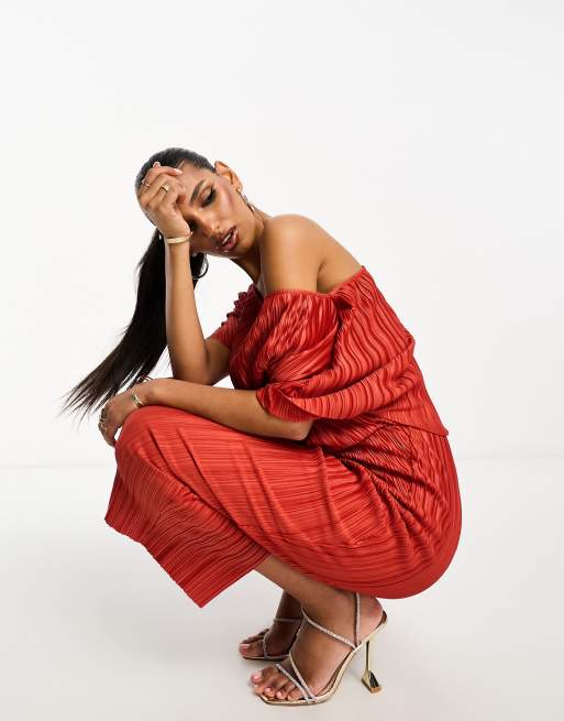 ASOS DESIGN Pliss jurk met afhangende schouder in roestbruin Very well made.