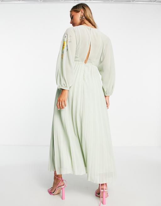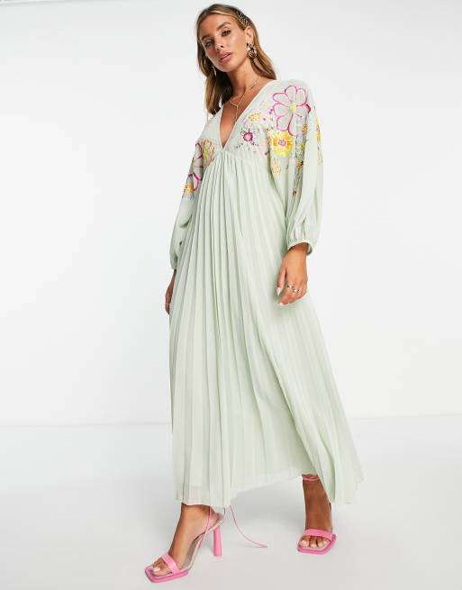 ASOS DESIGN v front baby doll pleated embroidered midi dress in pastel green Very well made.