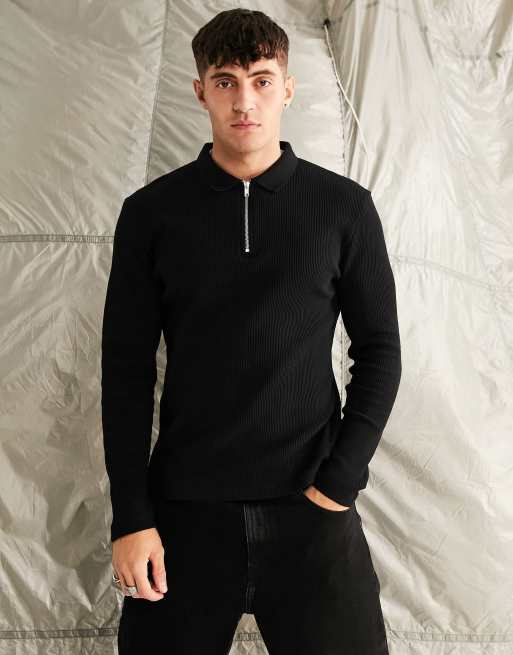 ASOS DESIGN Polo met lange mouwen korte rits en wafeltextuur in zwart Very well made.