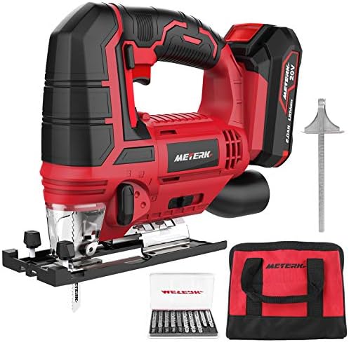 Meterk Jigsaw 20V Cordless Jig Saw for Woodworking with LED 4 Orbital 45 Bevel Angle Tool free Blade Changing 10 Blades Place Inside the Small Very well made.