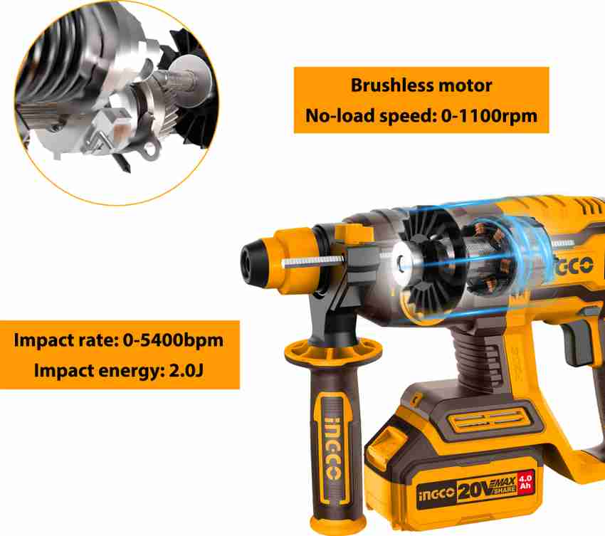INGCO Brushless Rotary Hammer 4.0Ah Battery and Charger 5400BPM 2.0J 1100RPM with 3 Drills and 1 Chisel Rotary Hammer Drill Price in India Buy INGCO Brushless Rotary Very well made.