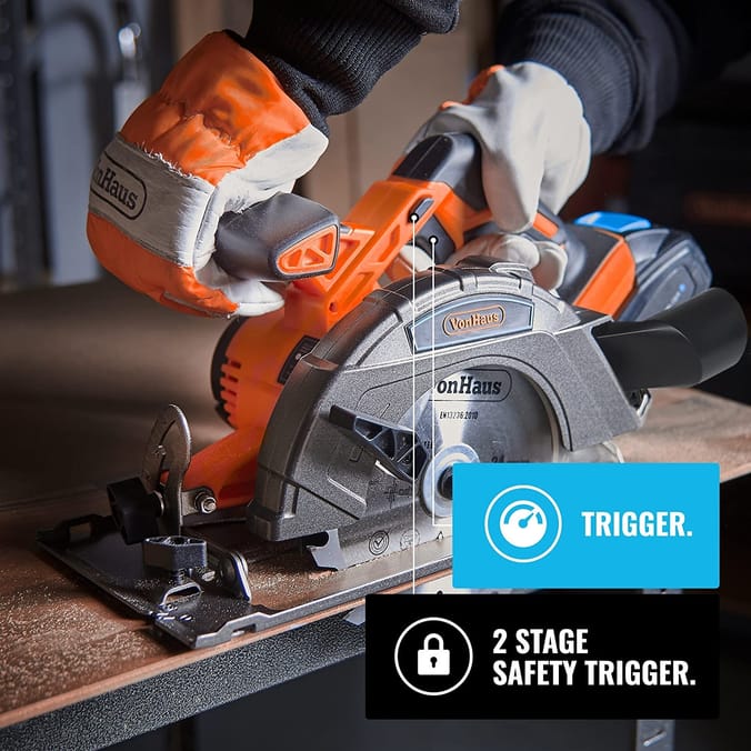 VonHaus Cordless Circular Saw with 3.0Ah Li ion 20V MAX Battery Charger 1 x 165mm 6 TCT Tip Blade Power Tool Bag Includes Ergonomic Rubber Grip Variable Cutting Angle Depth Very well made.