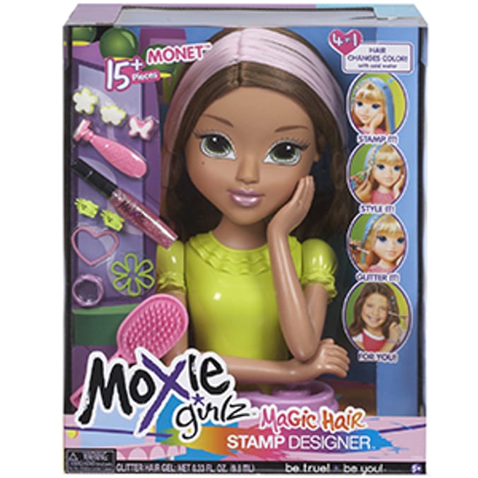 Moxie Girlz Head Magic Hair Stamp Designer new colour styling head hairdressing childrens girls educational glitter clips brush doll large Home Bargains Very well made.