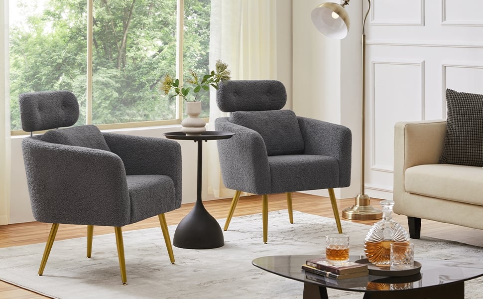 Yaheetech Boucle Barrel Accent Chair with Adjustable Headrest Lumbar Pillow Gold tone Metal Legs Upholstered Living Room Chair Dark Gray Very well made.