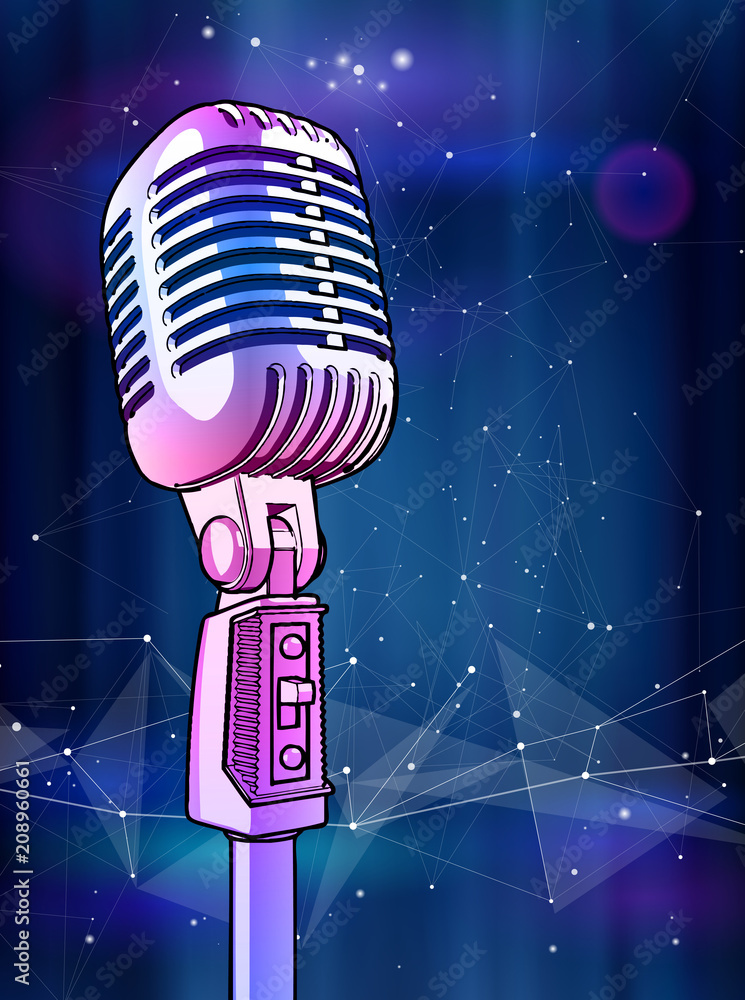Violet microphone on a dark cosmic background vector image. A Very well made.