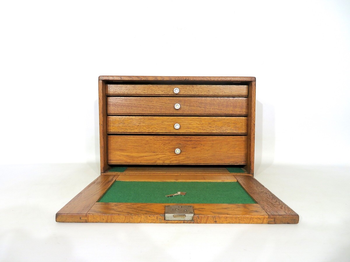 A Neslein oak portable tool chest fitted with numerous shallow drawers and detachable front cover including contents 39cm high 51cm wide 23cm deep Very well made.