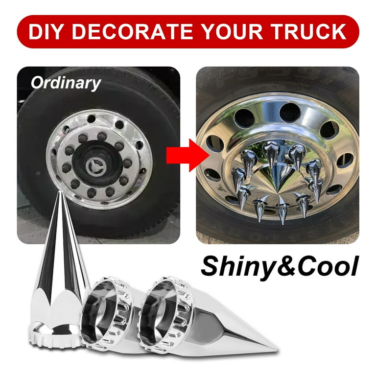 33mm x 4 3 4 Chromed Spike Lug Nuts Covers Thread On ABS Chrome Plastic Caps Pointed Screw on Lug Nut Cover for Semi Trucks 20 PCS Very well made.