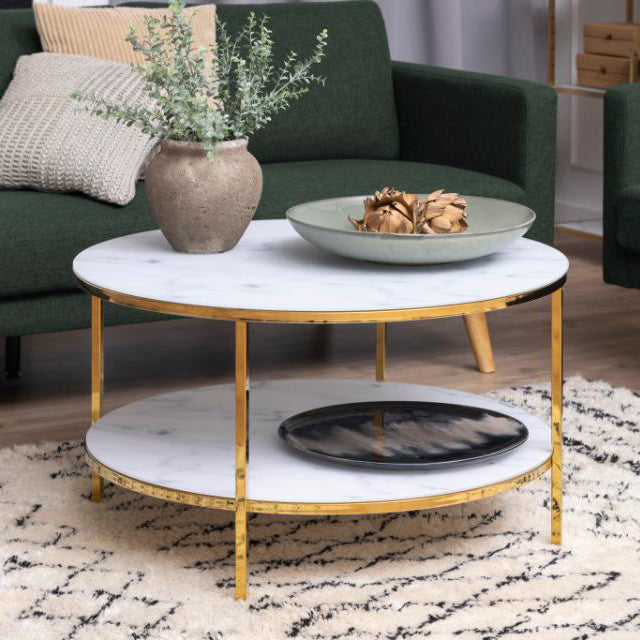 Alisma Designer White Glass Marble Coffee Table With Shelf And Gold Metal Frame 80cm Very well made.