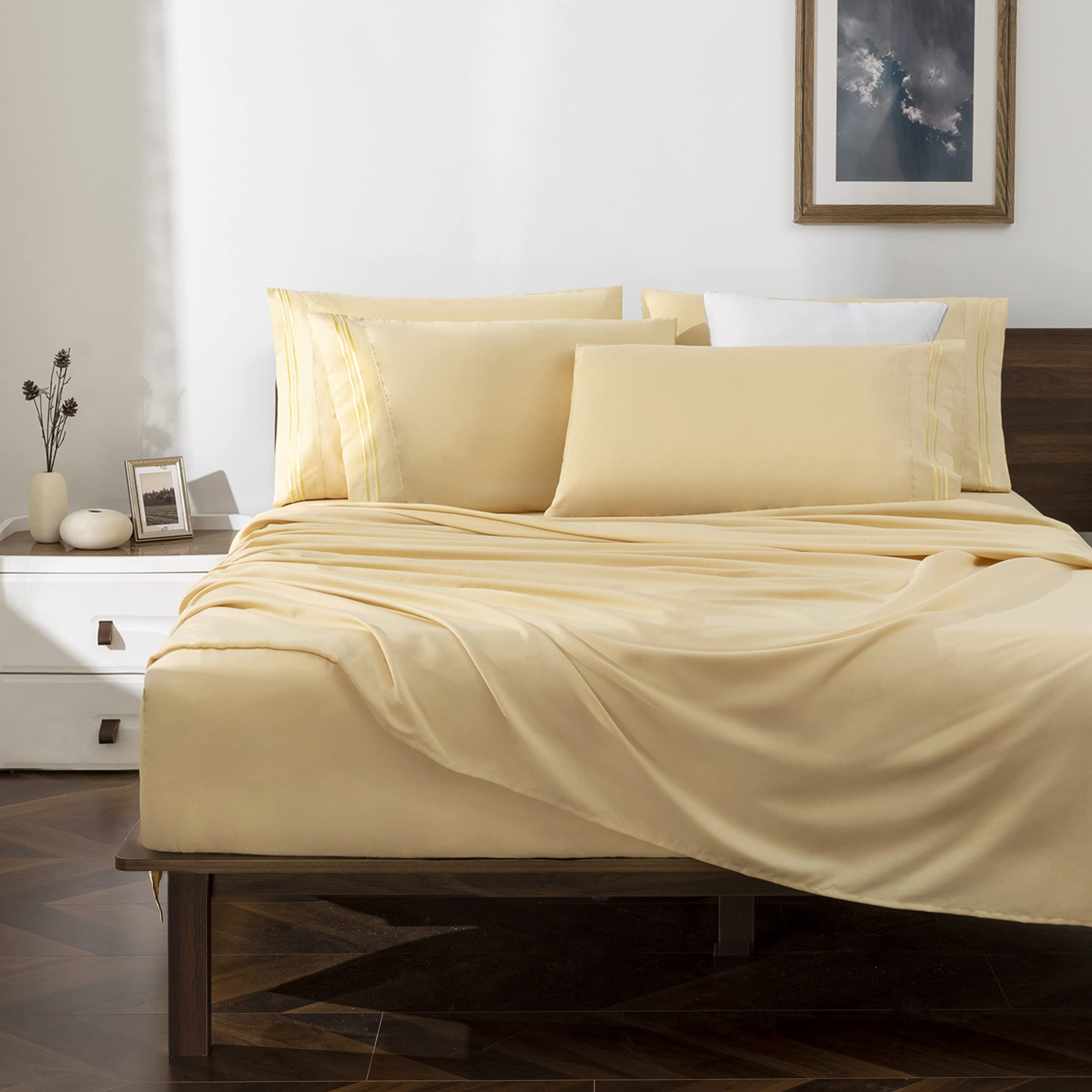 Horbaunal Light Yellow Queen Size Sheet Set 6 Piece Luxury 1800 Thread Count Bedding Sheets Pillowcases 16 Inch Deep Pocket Microfiber Bedding Very well made.