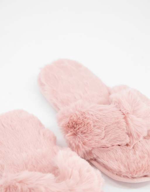 ASOS DESIGN Neve cross strap fluffy slider slippers in pink ASOS Very well made.