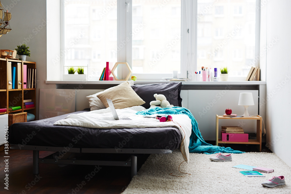 Modern messy girl bedroom with large bed laptop teddy bear and Very well made.