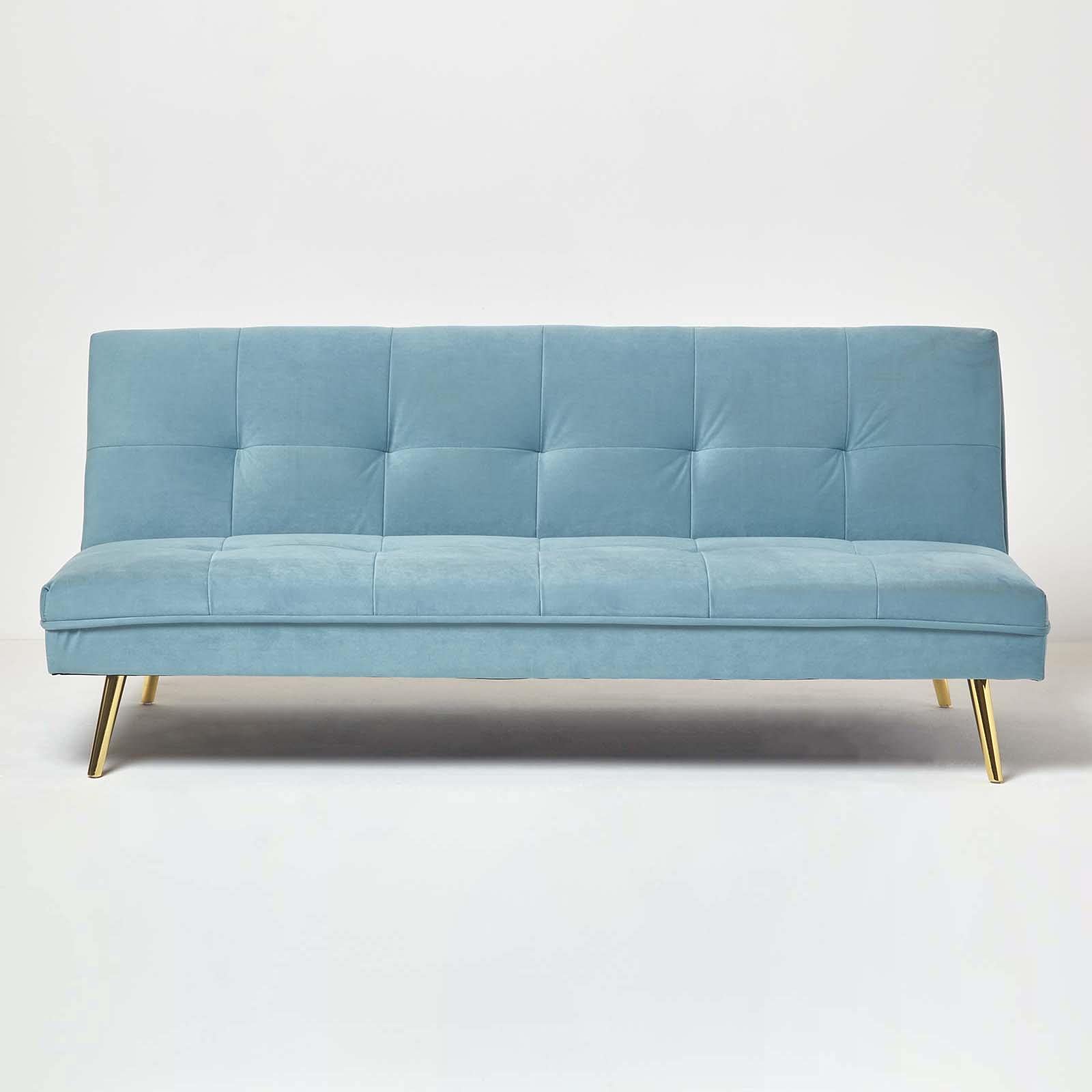 HOMESCAPES Velvet Sofa Bed Blue 3 Seater Sofa Click Clack Bed Sleeper without Armrests Retro Range Laurie Bed Settee on Black Metal Legs for Study Very well made.