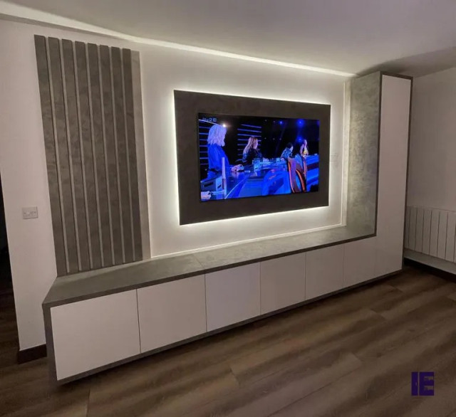 L shaped Floor TV Unit in Grey Gloss Finish in Watford by Inspired Elements Modern Home Cinema London by Inspired Elements Ltd Houzz UK Very well made.