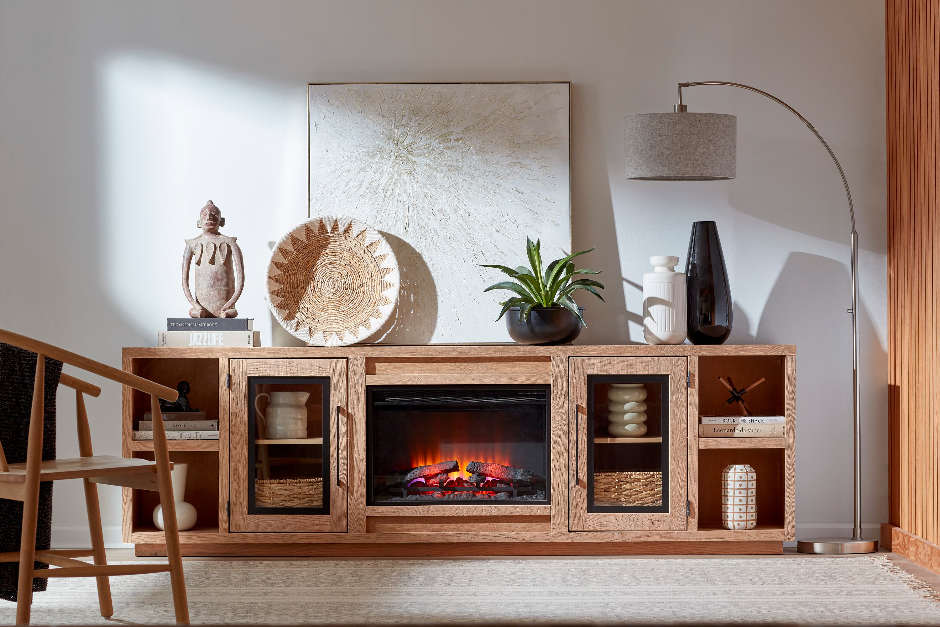 Aspenhome Paige 8553015 Transitional Fireplace Console Table with Open Shelving and Glass Doors Johnny Janosik TV Stands Very well made.