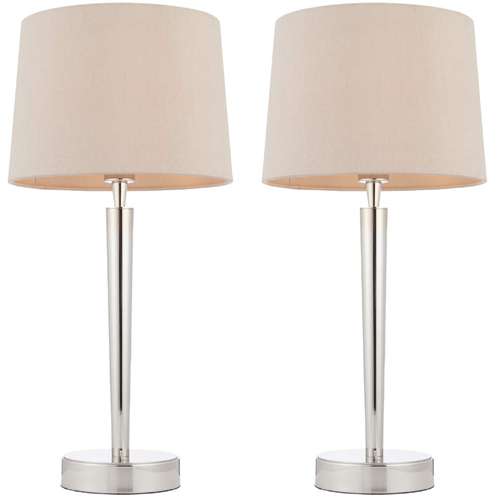 2 Pack 40W E14 515mm Tall Modern Table Lamp Light Built in USB Charger Bright Nickel Base Mink Fabric Shade Round Bedroom Bedside Sideboard Very well made.