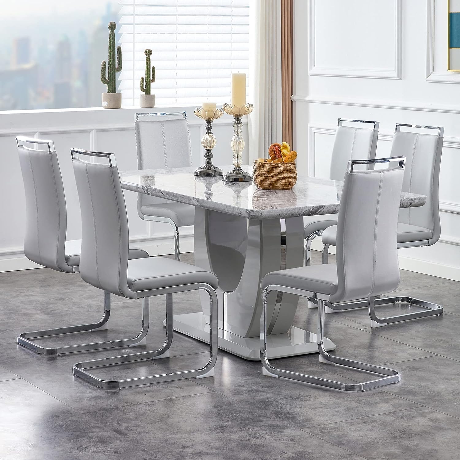 Amazon 7 Piece Grey Marble Dining Table Set Rectangular 63 inch Faux Marble Dining Room Table and 6 Grey Upholstered Leather Dining Chairs Very well made.