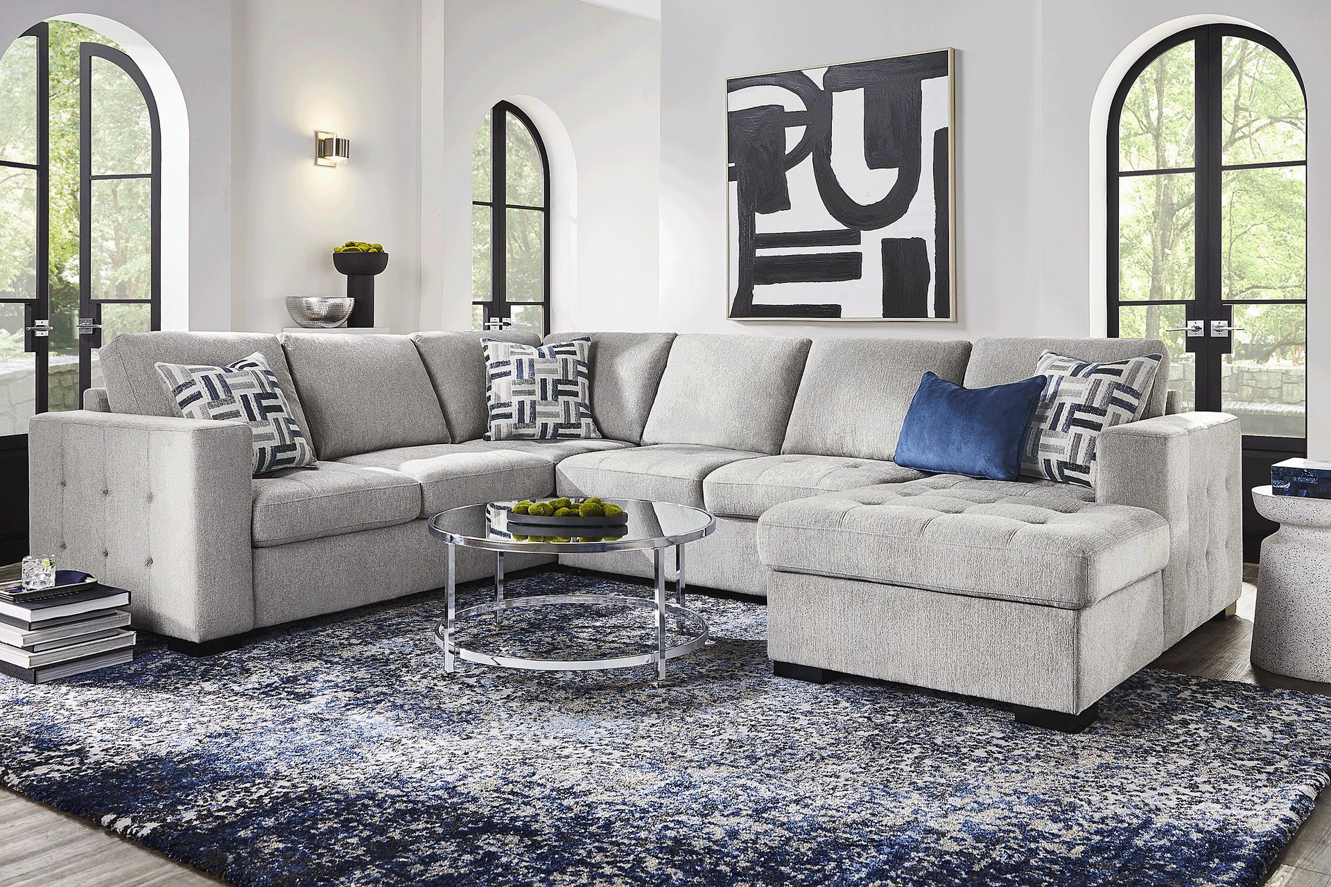 Geneva 6 Pc Gray Textured Living Room Set With 3 Pc Raf Storage Sleeper Sectional Cocktail Table End Table Lamp Rooms to Go Very well made.