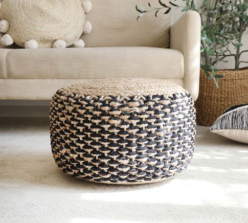 Tan Black Handwoven Basketweave Jute Pouf Pottery Barn Very well made.