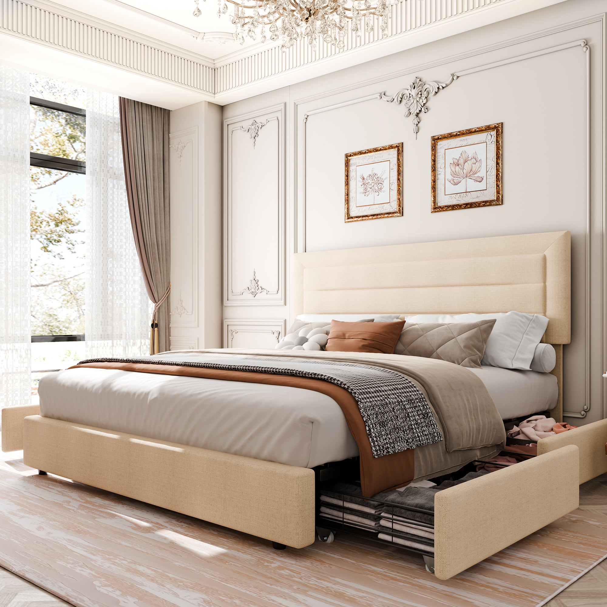 Walsunny Bed Frame with 4 Storage Drawee Platform Bed with Upholstered Modern Geometric Lines Headboard Solid Wood Slats Support Very well made.