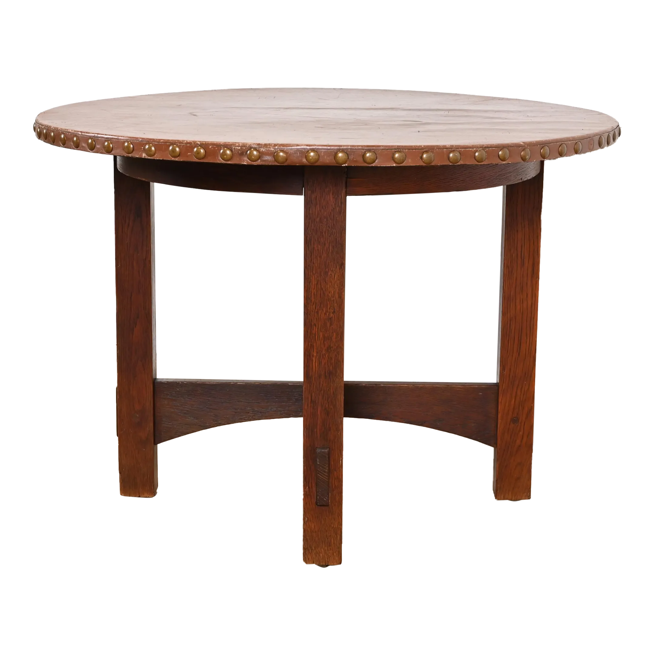 Gustav Stickley Antique Mission Oak Arts Crafts Leather Top Center Table or Breakfast Table Circa 1900 Very well made.