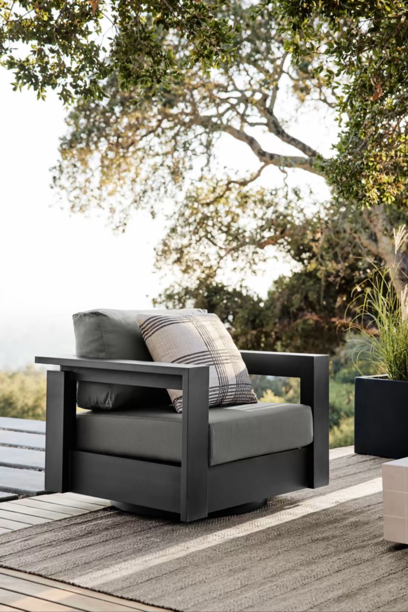 Walker Grey Metal Outdoor Swivel Lounge Chair with Flax Beige Sunbrella Cushions Crate Barrel Very well made.