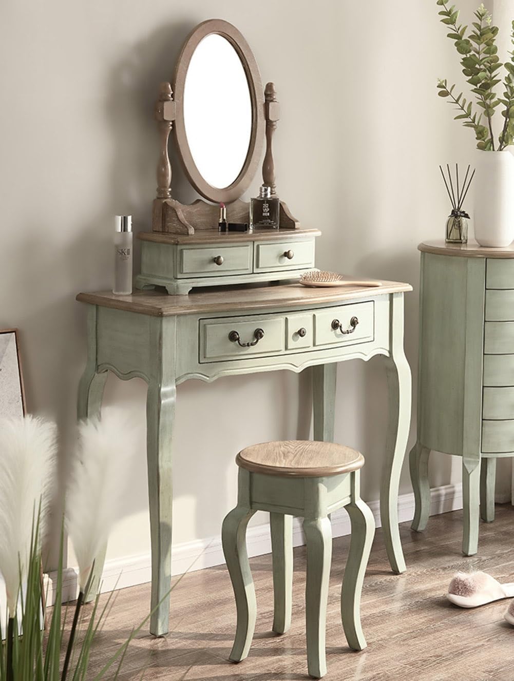 Shabby Chic Vanity Desk Accent Dressing Table with Drawers and Stool Makeup Table for Bedroom Antique Blue 85 X 40 X 78cm Color Blue Size 80cm Table Stool Amazon Home Very well made.
