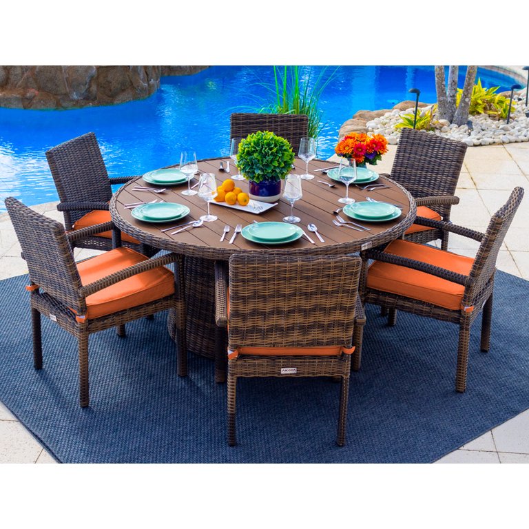 Tuscany 7 Piece Resin Wicker Outdoor Patio Furniture Round Dining Table Set with Dining Table and Six Cushioned Chairs Half Round Brown Wicker Sunbrella Canvas Tuscan Walmart Very well made.