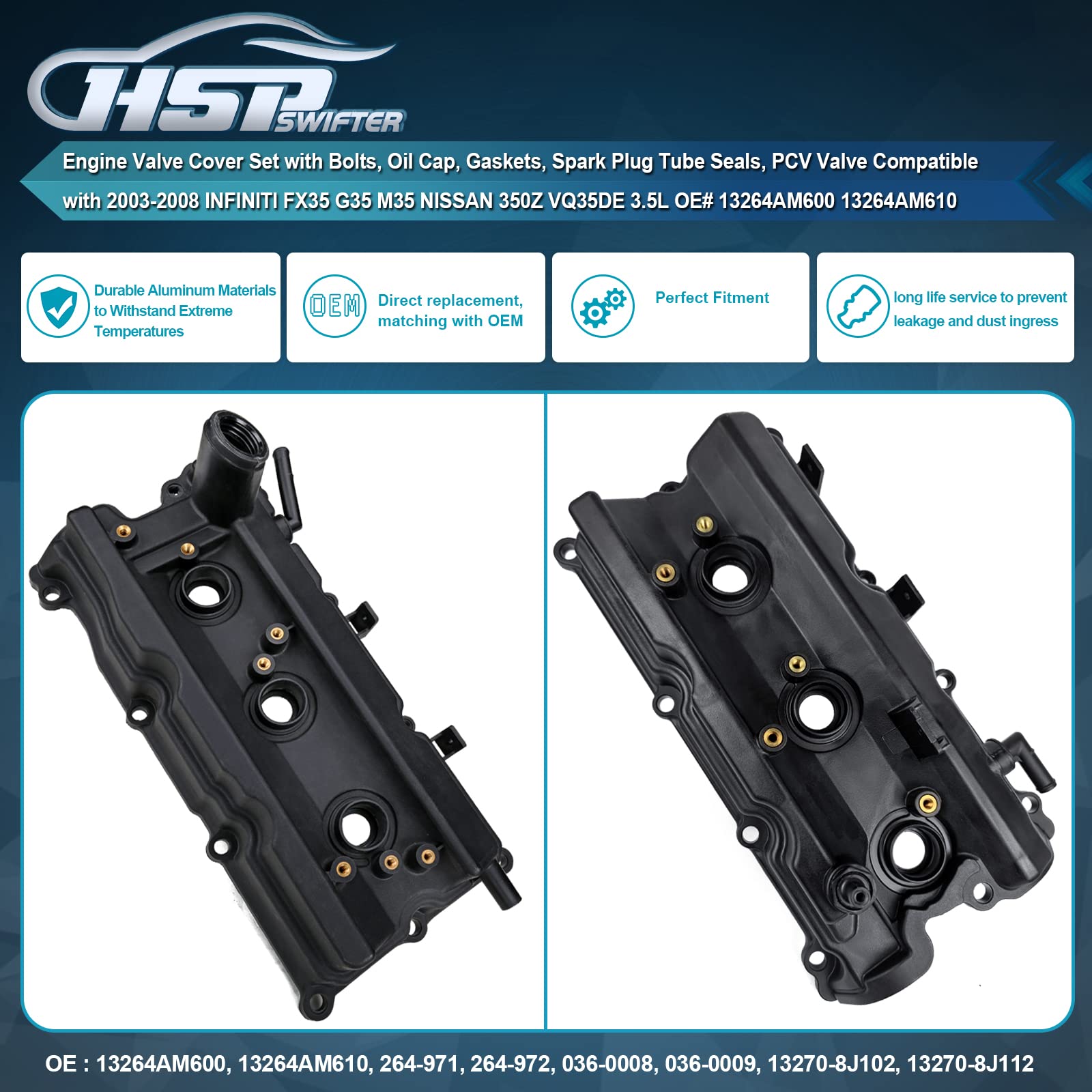 HSPSWIFTER Engine Valve Cover Set with Bolts Oil Cap Gaskets PCV Valve Compatible with 2003 2008 INFINITI FX35 G35 M35 NISSAN 350Z VQ35DE 3.5L OE Very well made.