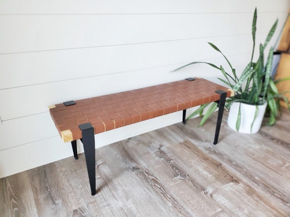 Woven Natural Leather Strap Bench Saddle HANDMADE Entryway bench and of bed benche Teak Woven Leather Benches Woven Leather Stool Very well made.