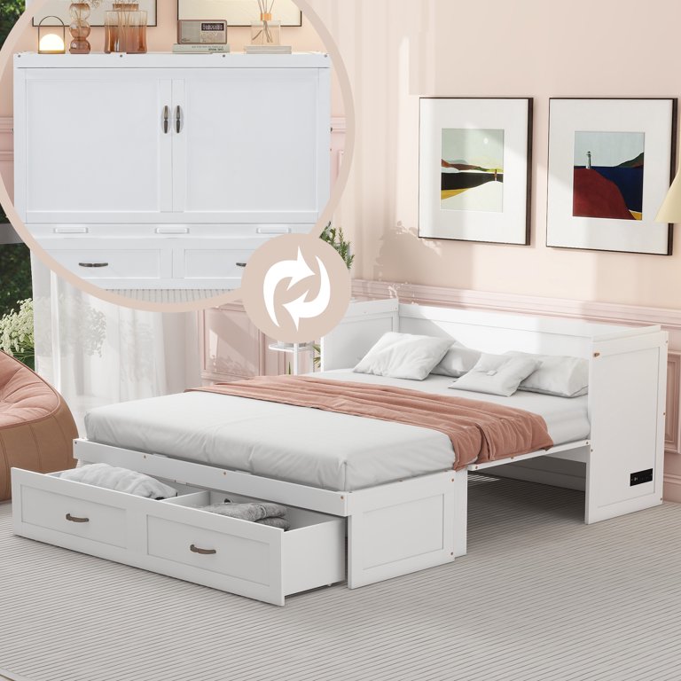 Queen Murphy Bed with USB Charging Storage Drawers and Sturdy Pine Wood Frame Easy Assembly White Very well made.