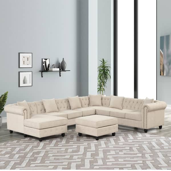 4 Piece Beige Linen Corner Sectional 132in.W Rolled Arms U Shape Sectional Sofa in. with Ottoman Very well made.