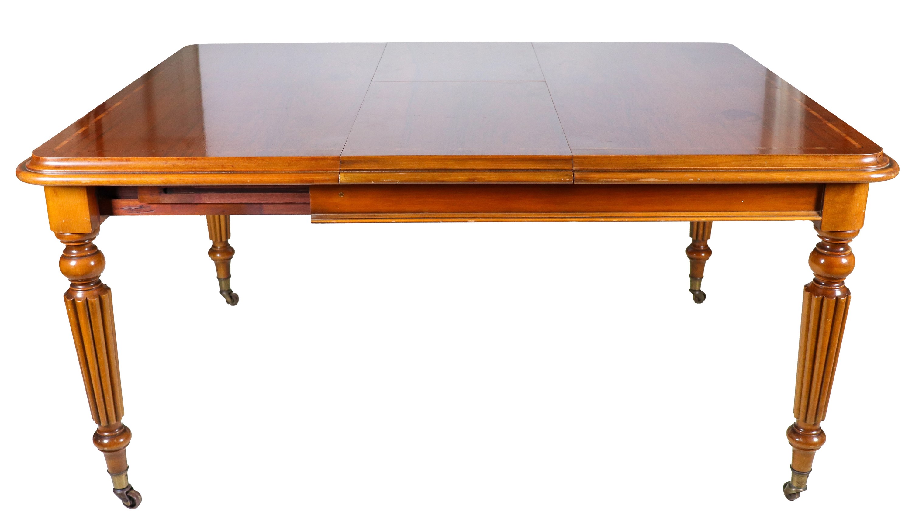 Antique Victorian era extendable dining table in walnut with threaded inlaid top four pod legs and opening with crank mechanism. A 40 cm extension Auction Timed Auction FINE ART ANTIQUE Very well made.