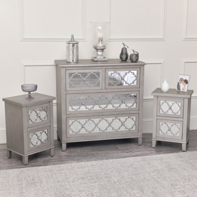 Bedroom Furniture Silver Mirrored Chest Of Drawers Pair Of Bedside Tables Tiffany Range by Debenhams ufurnish Very well made.