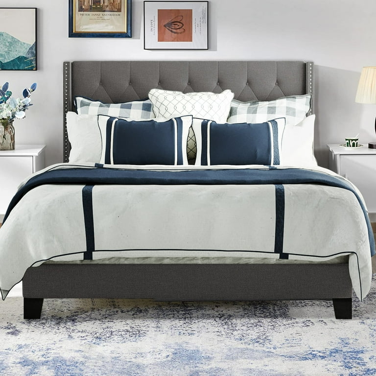 Harper Non Tufted Upholstered Tall Headboard and Side Storage Platform Bed with Pewter Nailheads Queen Sunbrella Performance Herringbone Light G Very well made.