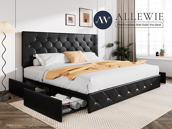 Allewie King Size Black Metal Faux Leather Platform Bed Frame with 4 Drawers Very well made.