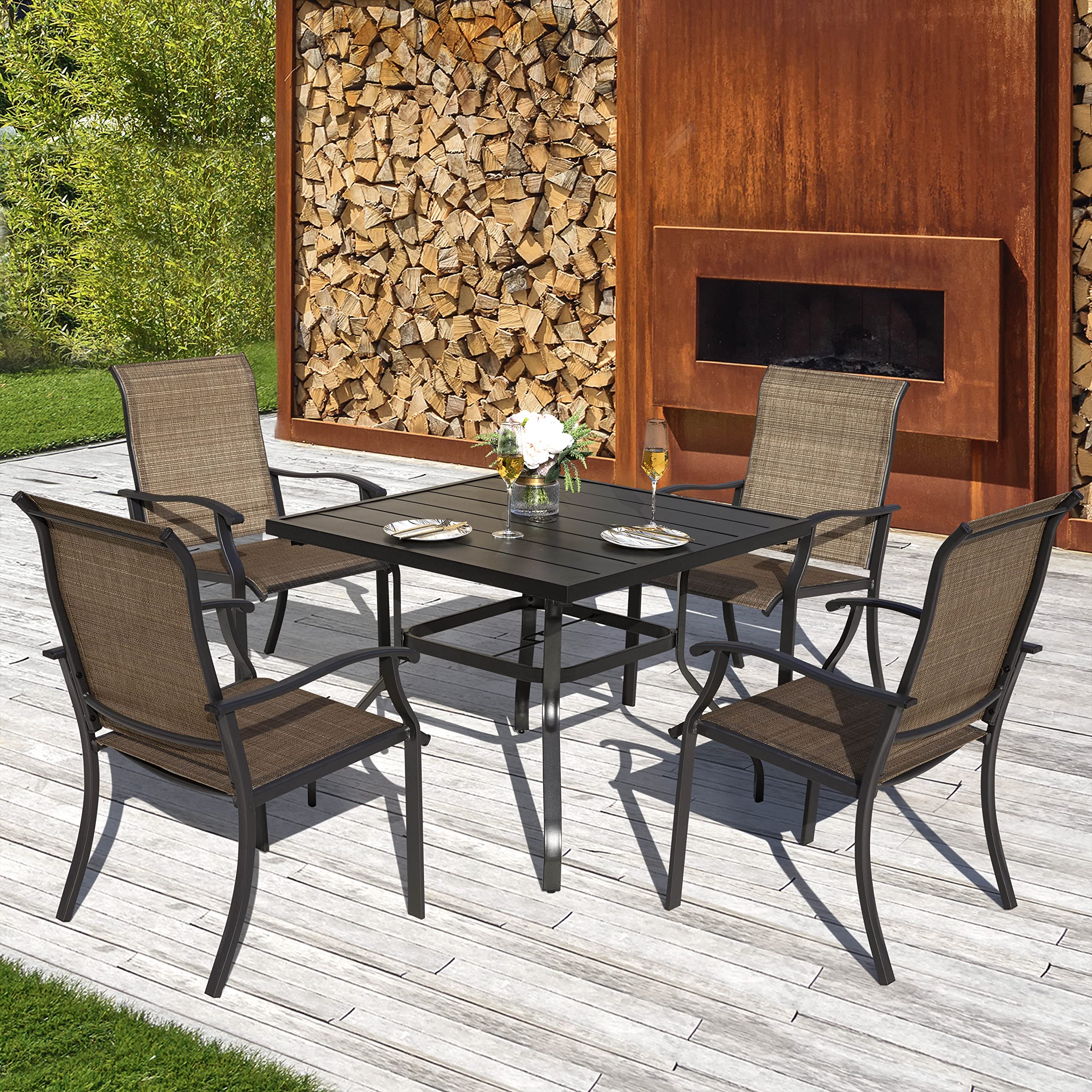Amazon NUU GARDEN 5 Piece Patio Dining Set Outdoor Table and Chairs Set for Garden Patio Backyard 4 Textilene Dining Chairs and 1 Iron Patio Table with Umbrella Hole Black and Brown Very well made.
